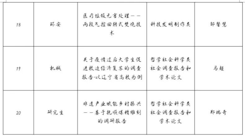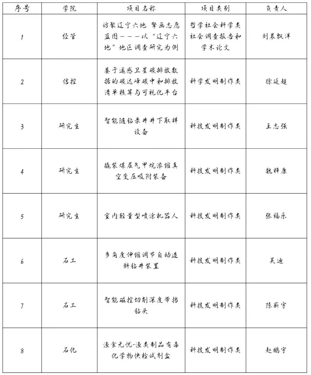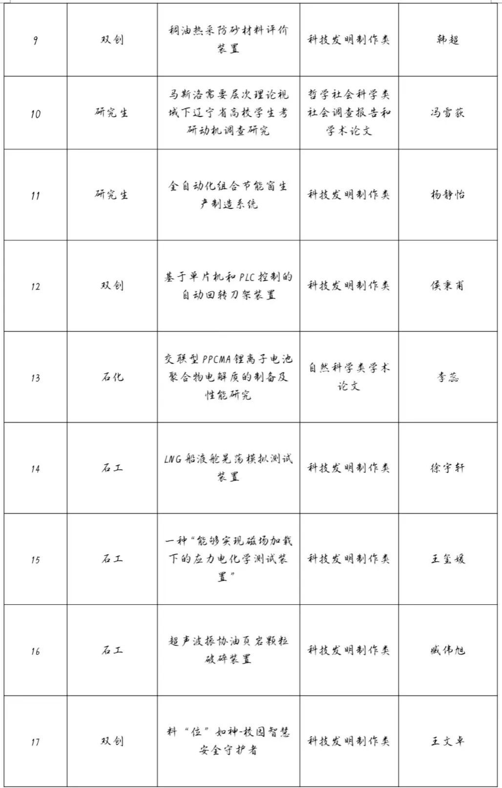 根据“挑战杯”竞赛章程,校团委组织开展了我校2023年“挑战杯”校级选拔赛,经个人申报,学院推荐,校级审核、遴选,终审答辩环节,最终评选出20件作品代表辽宁石油化工大学参加省级竞赛。