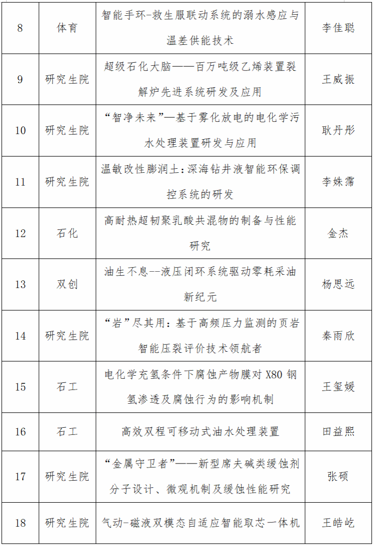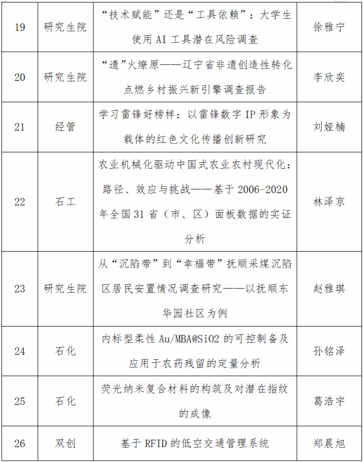 根据“挑战杯”竞赛章程,校团委组织开展了我校2025年“挑战杯”校级选拔赛,经个人申报,学院推荐,校级审核、遴选,终审答辩环节,最终评选出26件作品代表辽宁石油化工大学参加省级竞赛。