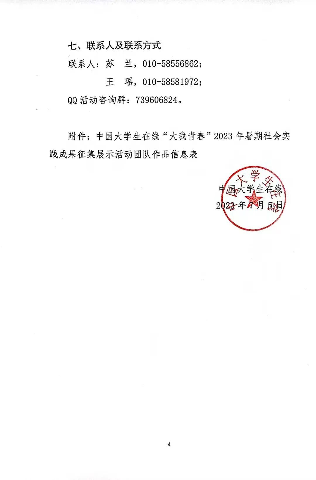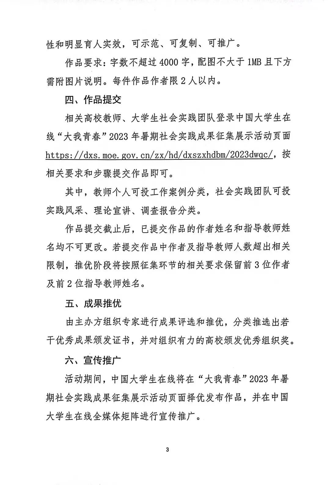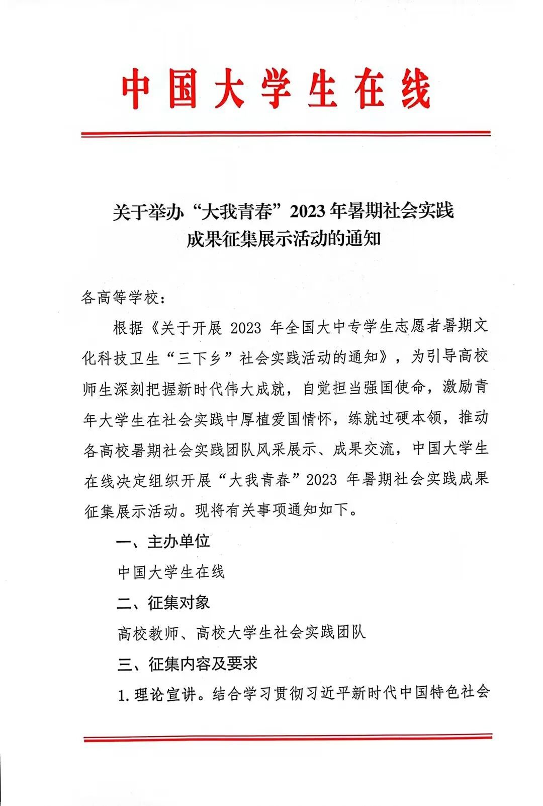 为引导高校师生深刻把握新时代伟大成就,自觉担当强国使命,激励青年大学生在社会实践中厚植爱国情怀,练就过硬本领,推动各高校暑期社会实践团队风采展示、成果交流,中国大学生在线决定组织开展“大我青春”2023 年暑期社会实践成果征集展示活动。